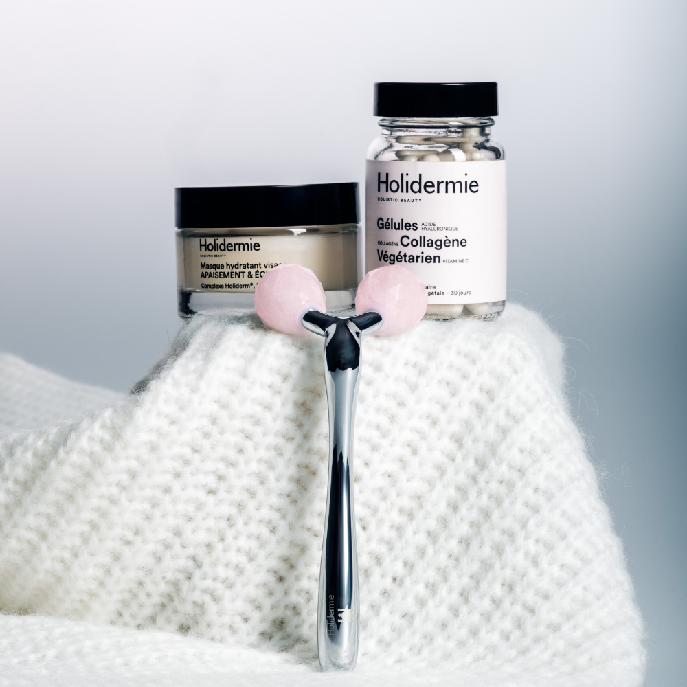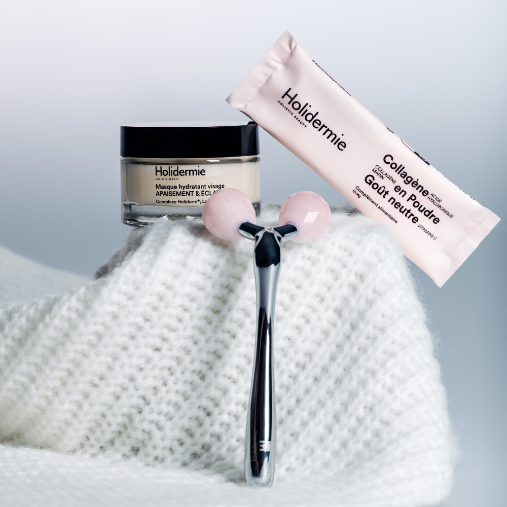 Ce rituel Holidermie combine des soins et compléments pour une peau visiblement plus hydratée, ferme et éclatante. Le Masque Hydratant Visage offre une hydratation intense, lisse et repulpe la peau grâce à des céramides et de l’acide hyaluronique qui renforcent la barrière cutanée et réduisent les signes de sécheresse ; le Roller V Liftant Visage en quartz rose stimule la microcirculation, aide à lisser les rides, redessiner l’ovale du visage et booster l’éclat du teint tout en améliorant la pénétration des soins ; les Sticks de collagène en poudre favorisent la fermeté, l’élasticité et l’hydratation de la peau tout en contribuant à la beauté des ongles et des cheveux ; et les gélules de collagène végétarien complètent cette routine en soutenant la structure cutanée et l’éclat général de la peau de l’intérieur.