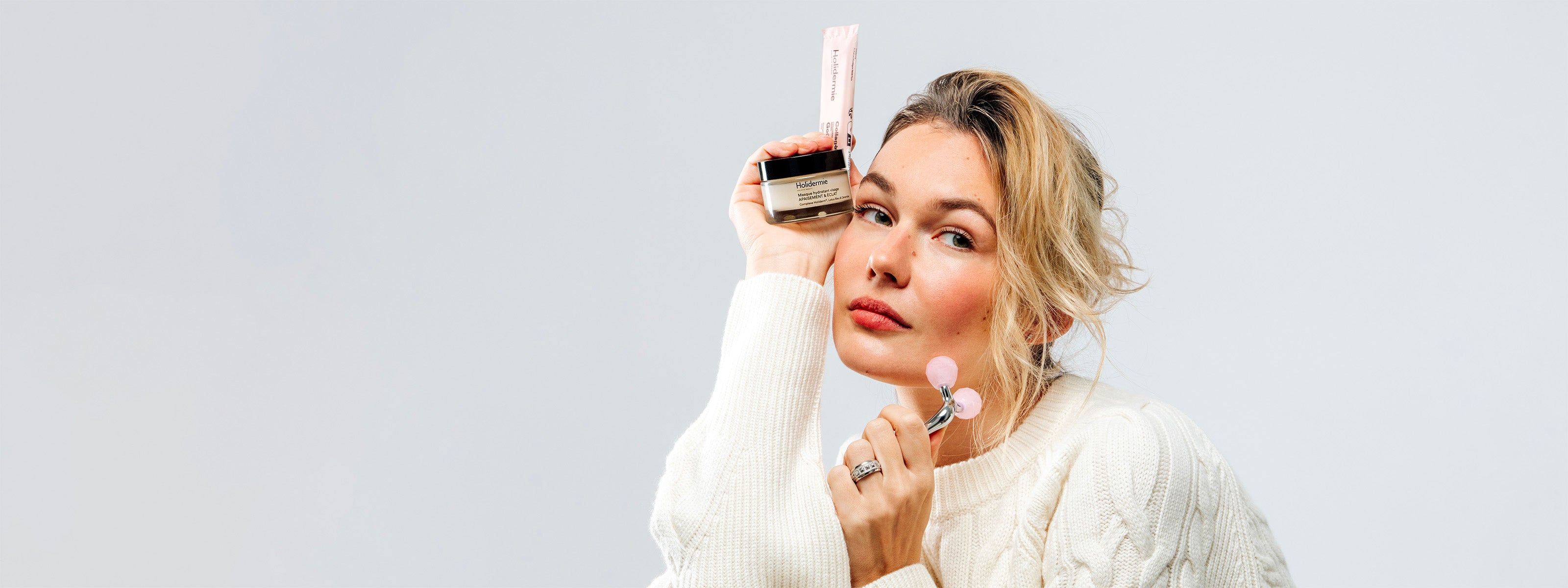 Plus que jamais, elle a besoin d’un accompagnement global, pensé à la fois pour la nourrir, la tonifier et préserver son confort.Le Rituel HoliCold répond à ces besoins essentiels à travers une approche complète et cohérente : soutenir la peau de l’intérieur grâce au collagène, lifter et réveiller les traits par le massage, puis repulper et hydrater intensément avec un soin cocooning.